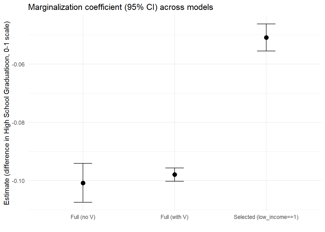 lm_sel <- lm(hs_grad ~ Marginalization, data = df[df$low_income_nhood == 1,]) # selected-only